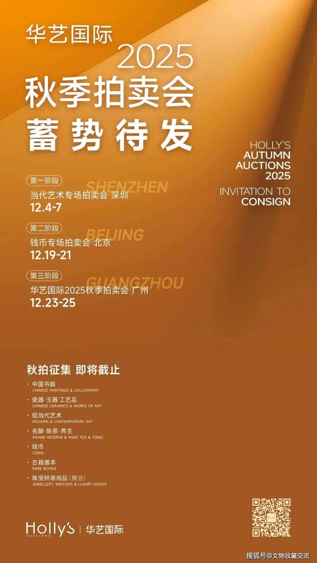 【华艺国际2025秋拍定档】华艺国际拍卖近日宣布,其2025秋季拍卖会将于12月启幕。此次秋拍共分三个阶段举行,第一阶段为当代艺术专场拍卖会,将于12月4至7日在深圳举槌;第二阶段为钱币专场拍卖会,将于12月19至21日在北京举槌;第三阶段华艺国际2025秋季拍卖会将于12月23至25日在广州举槌。拍卖涵盖中国书画、瓷器·玉器·工艺品、现当代艺术、名酿·陈茶·养生、钱币、古籍善本、珠宝钟表尚品等多个门类。(消息来源:华艺国际拍卖;发布时间:2025年10月31日)
