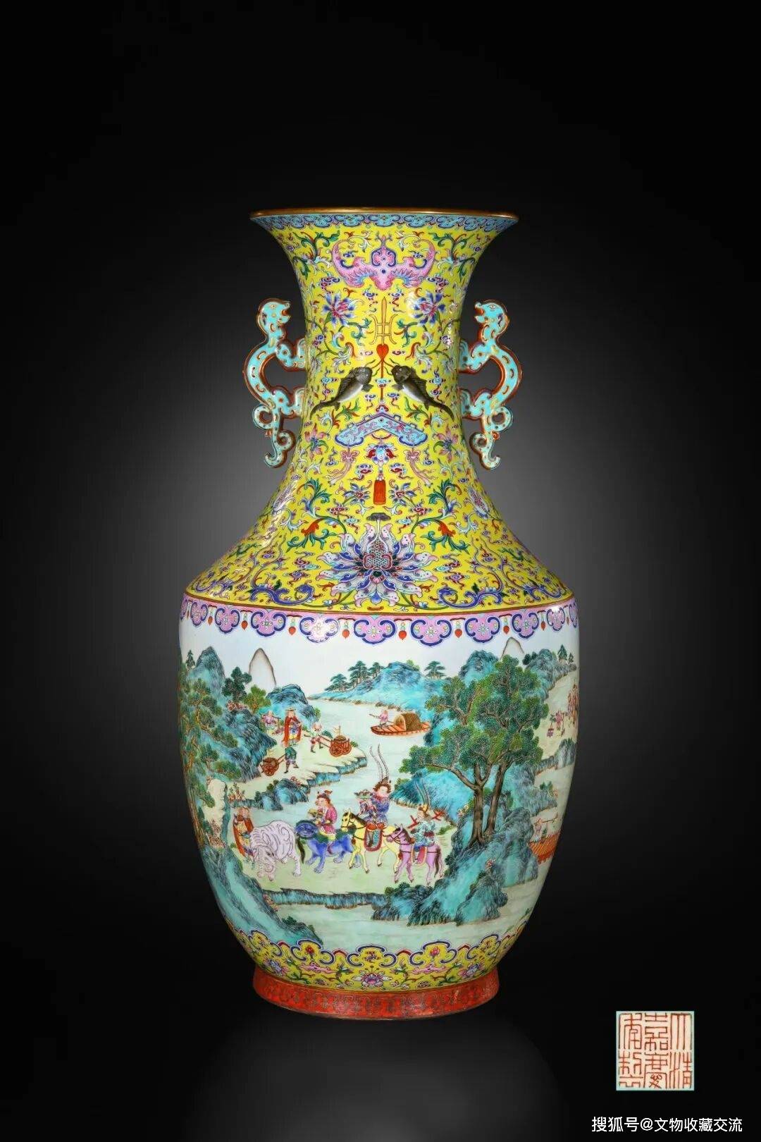 【保利拍卖将呈嘉庆黄地洋彩双龙耳大瓶】10月29日,北京保利拍卖官宣了一件清嘉庆黄地洋彩“八蛮献宝”双龙耳大瓶。该瓶高达74厘米,曾为法国迪诺公爵家族旧藏,传承有序。整器以黄釉为地,颈部绘蝙蝠、鲶鱼、莲花、灵芝等吉祥纹饰,寓意“洪福齐天”“吉庆有余”“福寿连绵”。腹部通景描绘“八蛮进宝”图,人物生动,景致层次分明,融合中国工笔线条与西方油画色彩,呈现出中西合璧的独特风格。此瓶不仅体量宏大、工艺精湛,更兼具文化与艺术价值,堪称嘉庆官窑洋彩之杰作。(消息来源:北京保利拍卖;发布时间:2025年10月29日)